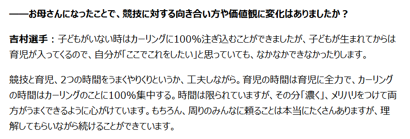 子供がいない頃はカーリングに100%注げた時間も、今は限られています。