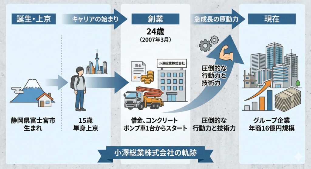小澤辰矢さんは、壮絶な逆境を乗り越え、中卒から一代で建設業界のトップに登りつめた、まさに「令和」を代表する経営者です。