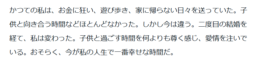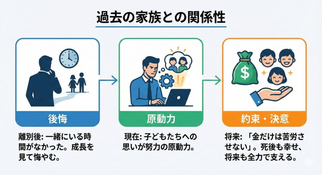 過去の選択を深く後悔し、それを今の社会貢献活動と現在の家族への献身へと昇華させているのです。